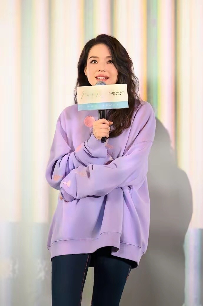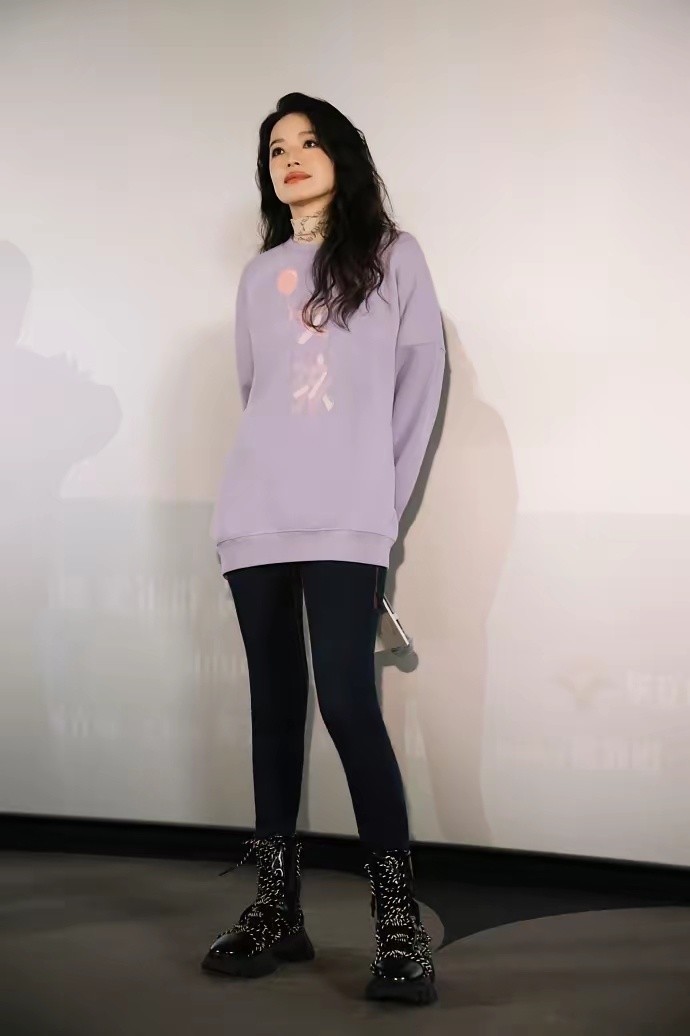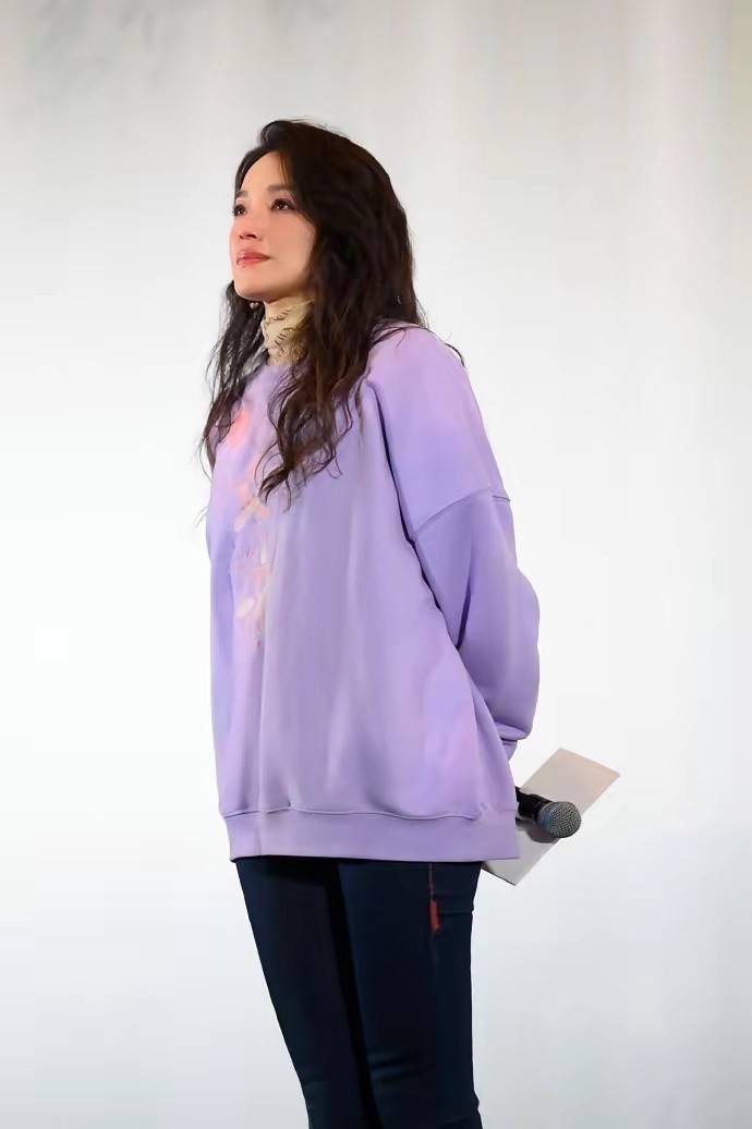 那不妨先来看一下女明星舒淇的穿搭,49岁的她换了一款新的卷发造型,看起来很时尚,身穿一件紫色的卫衣,搭配上一条修身裤,轻松展现出她的好身材,减龄又高级。