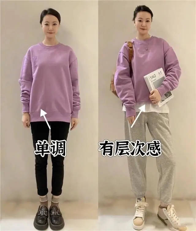 如果想要把卫衣穿出高级感,确实还是要讲究一点搭配方式的,不是简单的一件卫衣搭配上裤子就能轻松穿出高级感,毕竟普通熟人的颜值身材没法和女明星媲美,这时候我们可以用叠加的穿搭方式,紫色的卫衣内搭白色T恤,加上一条灰色的牛仔裤,这样的叠加穿搭方式,层次感更分明。